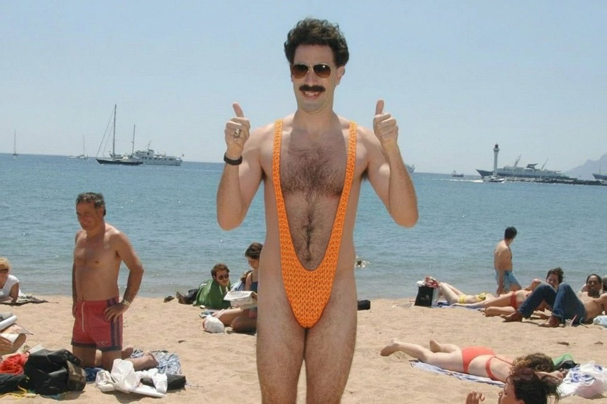Borat in Banana Hammock on Beach - Sacha Baron Cohen meme template