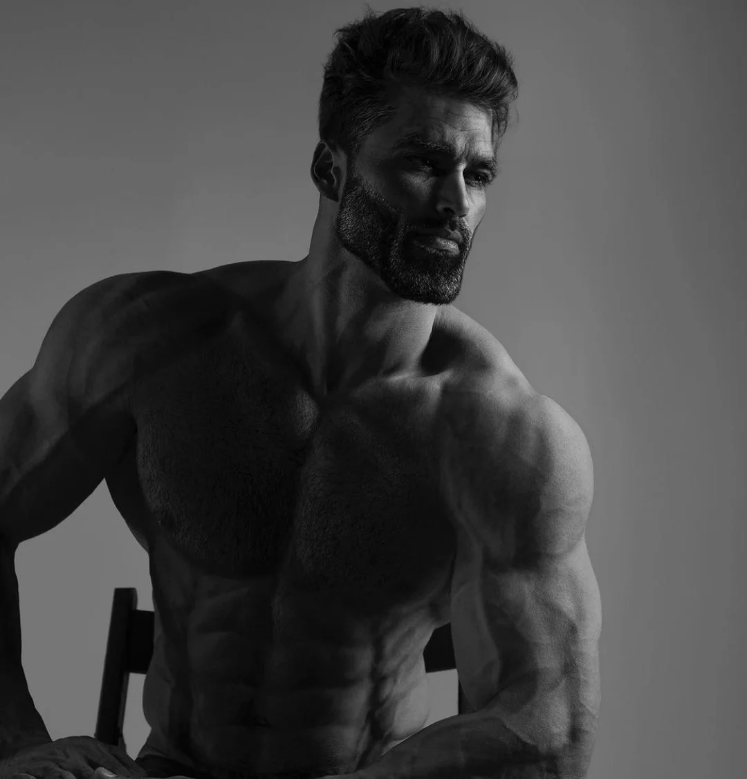 The GigaChad meme revolves around a fictional character named GigaChad, who is portrayed as the epitome of the ultra-masculine and strikingly attractive male archetype known as Chad Thundercock. The name "GigaChad" conveys an exaggerated version of this archetype. This character originates from a series of highly edited photographs, featuring models that are part of the art project by Russian photographer Krista Sudmalis for her project called Sleek'N'Tears. The character, while initially believed to be a real person, is actually a creation within this artistic context. The photographs are uploaded on the project's Instagram profile and official website. The meme gained popularity particularly within various incel communities online.