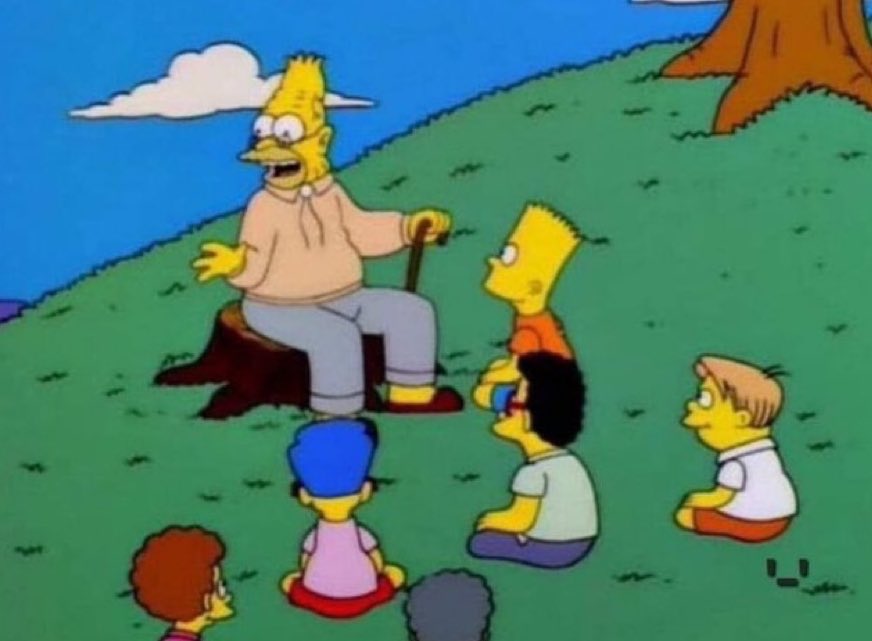 The "Abe Simpson Talking To Kids" meme, also known as "Grandpa Simpson Telling A Story" or "Hey Everybody, An Old Man Is Talking," features an image macro of Abe Simpson, Homer Simpson's father from the TV show 'The Simpsons.' In this template, Abe is seen storytelling to a group of attentive kids seated around him in front of a lemon tree. This scene is often used on social media to humorously comment on 'outdated' trends or news, depicting Abe as someone rambling about old stories to a younger, ostensibly uninterested audience.