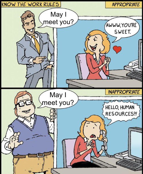 The meme originated with a comic titled 'Know the Work Rules' by artist Max Garcia of Sunny Street Comics, published on September 16th, 2013. Here is the original comic. The comic sets up a scenario involving a conventionally attractive male and an unattractive male both complimenting their female coworker differently, with her reactions depicted as either 'appropriate' or 'inappropriate.' This comic has been reposted frequently on platforms like Facebook and Reddit, while various edited versions have gained traction, including a popular Instagram post on November 4th, 2017, and an amusing Reddit Star Wars-themed meme posted by Bradley_Haran on May 5th, 2018. Additionally, the template was submitted to ShitpostBot 5000 on June 3rd, 2018, accessible here.