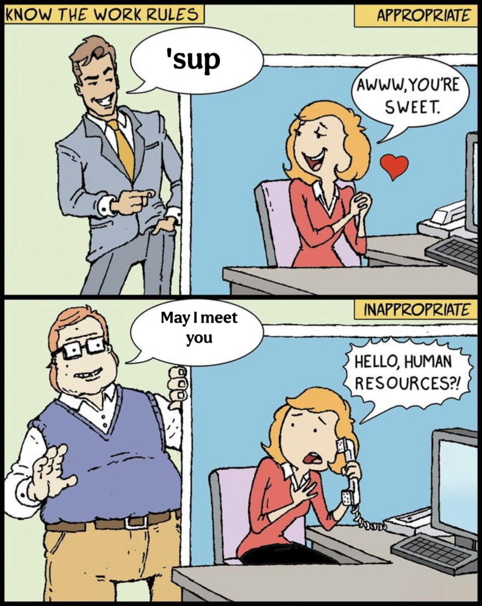 The 'Hello, Human Resources?!' meme, also referred to as 'Know the Work Rules,' is derived from a comic strip by Sunny Street that critiques perceived double standards in reactions to compliments based on the physical attractiveness of the male giving the compliment. The meme typically features two panels: the first shows a conventionally attractive man complimenting a female coworker who reacts positively, labeled as 'appropriate' behavior. The second panel shows a less attractive man giving the same compliment, to which the woman reacts negatively, labeled as 'inappropriate' behavior. This comic has been widely parodied by altering the text to reflect different scenarios or jokes.