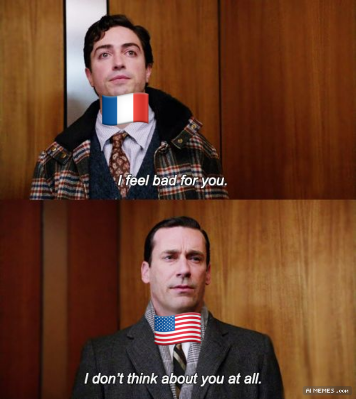 The 'I Feel Bad For You / I Don't Think About You At All' meme originates from a dialogue exchange in the TV drama Mad Men, featuring characters Don Draper (played by Jon Hamm) and Michael Ginsberg (played by Ben Feldman). This particular exchange involves a confrontational moment where Ginsberg expresses sympathy for Draper, to which Draper chillingly responds with indifference. The scene captures Draper delivering the line with a dismissive attitude while in an elevator, showcasing his typical aloof and commanding presence. This particular moment has since been widely used in various object-labeling memes, exploitable images, fan art, and parodies, where the text is adapted to different contexts or overlaid onto different images for humorous or poignant effect.