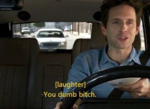 The "You Dumb Bitch" meme features a still image of Dennis Reynolds, a character from the TV show 'It's Always Sunny in Philadelphia'. In the image, Dennis is seated in a car, speaking with a smirk on his face. Subtitles on the image read '[laughter] - You dumb bitch.', capturing his reaction to a radio broadcast he finds amusing and ludicrous. This image is commonly used online to humorously express disbelief or ridicule towards someone's actions or statements that are perceived as foolish or overly naive.