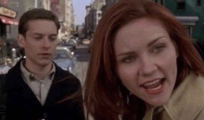 The 'Mary Jane Defending Peter Parker' meme features an image from the 2002 superhero film 'Spider-Man,' where the character Mary Jane Watson, played by Kirsten Dunst, is turning towards the camera with a significant expression, while Peter Parker, portrayed by Tobey Maguire, stands behind her, slightly out of focus. This reaction image is typically used online to humorously depict situations where Mary Jane is defending Peter or addressing someone else in defense of him.