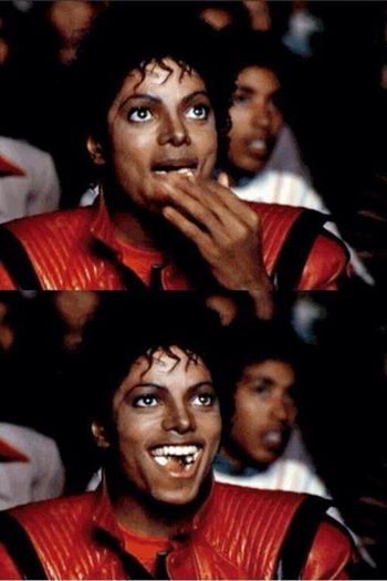 The meme has its roots on September 2nd, 2007, when a YTMND user named Chiyoumen published a GIF featuring Michael Jackson eating popcorn. The accompanying audio was the 1983 R&B track "Popcorn Love" by New Edition. The iconic GIF is clipped from a scene in Michael Jackson's 1982 "Thriller" music video, where Jackson is seen enjoying popcorn while watching a horror film in a movie theater. The notable scene from the Thriller music video can also be viewed here on YouTube.