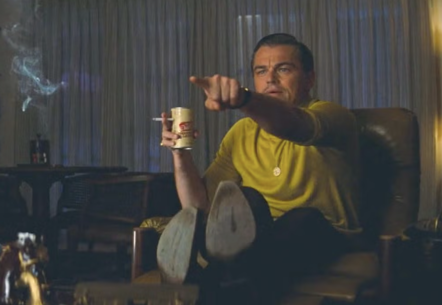 The meme is derived from a scene in 'Once Upon a Time in Hollywood', which was released on July 26, 2019. Leonardo DiCaprio’s character, Rick Dalton, and his stunt double, Cliff Booth, watch Dalton’s performance in the television show F.B.I. During the viewing, Dalton points out himself acting on screen. The earliest known meme usage of this image appeared online on February 7, 2020, when a user on Twitter (now X) @annaswnsn shared it with the caption 'when I notice the timeline changes in Little Women.'