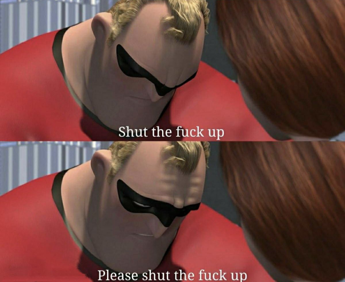 The meme 'Shut the Fuck Up, Please Shut the Fuck Up' features a two-panel image of Mr. Incredible from 'The Incredibles'. In the first panel, Mr. Incredible appears distressed and leans forward with the caption 'Shut the fuck up'. The second panel shows a closer view of his face, appearing more resigned, with the caption 'Please shut the fuck up'. This meme is frequently used online as a reaction to express annoyance or frustration towards a post or cultural occurrence.