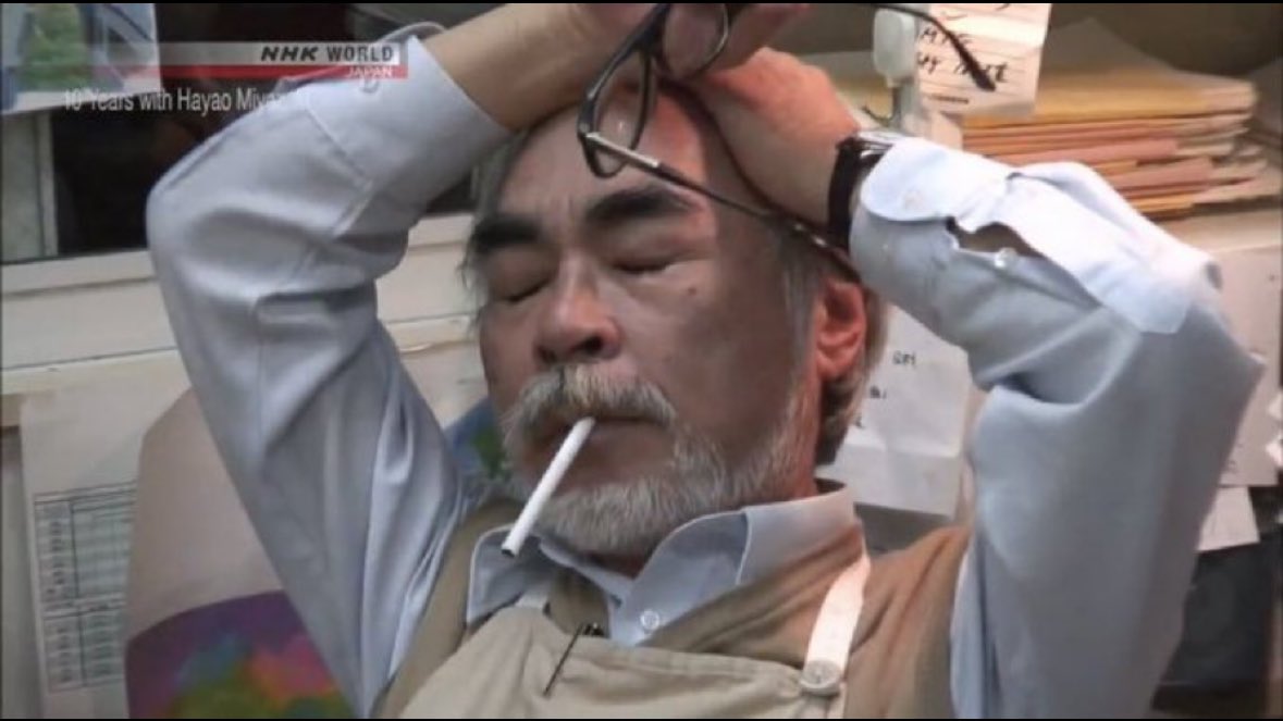 The 'Hayao Miyazaki Looking Stressed' meme features an image of Hayao Miyazaki, the renowned co-founder of Studio Ghibli, in a moment of apparent stress. In the image, Miyazaki is seen leaning back in his office chair, his eyes closed, with a cigarette dangling from his mouth. He is wearing a beige apron and glasses, which he holds aloft with one hand above his head. This image captures a candid moment of frustration or exhaustion, commonly used online to express feelings of being overwhelmed or exasperated in work and personal scenarios.