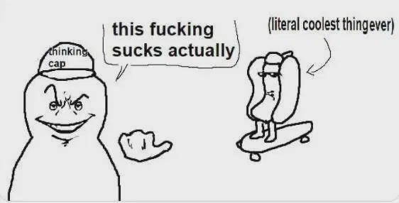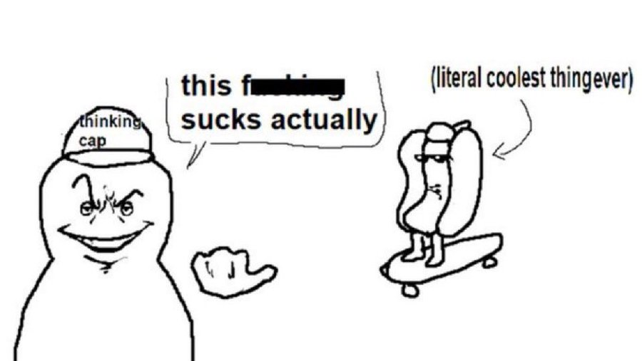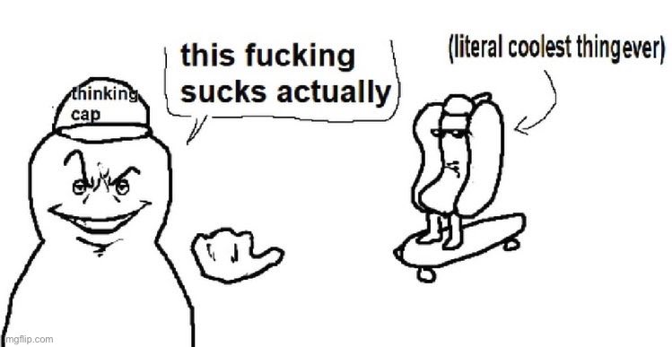 The 'This Fucking Sucks Actually, or Literal Coolest Thing Ever' meme features a webcomic by the artist FallenChungus. In the comic, a character with a whimsical expression is seen wearing a hat labeled 'thinking cap.' This character is pointing towards a hotdog mounted on a skateboard, which is labeled 'literal coolest thing ever.' The comic's dialogue from the character reads, 'this fucking sucks actually,' employed humorously to deem something ostensibly cool as unimpressive.
