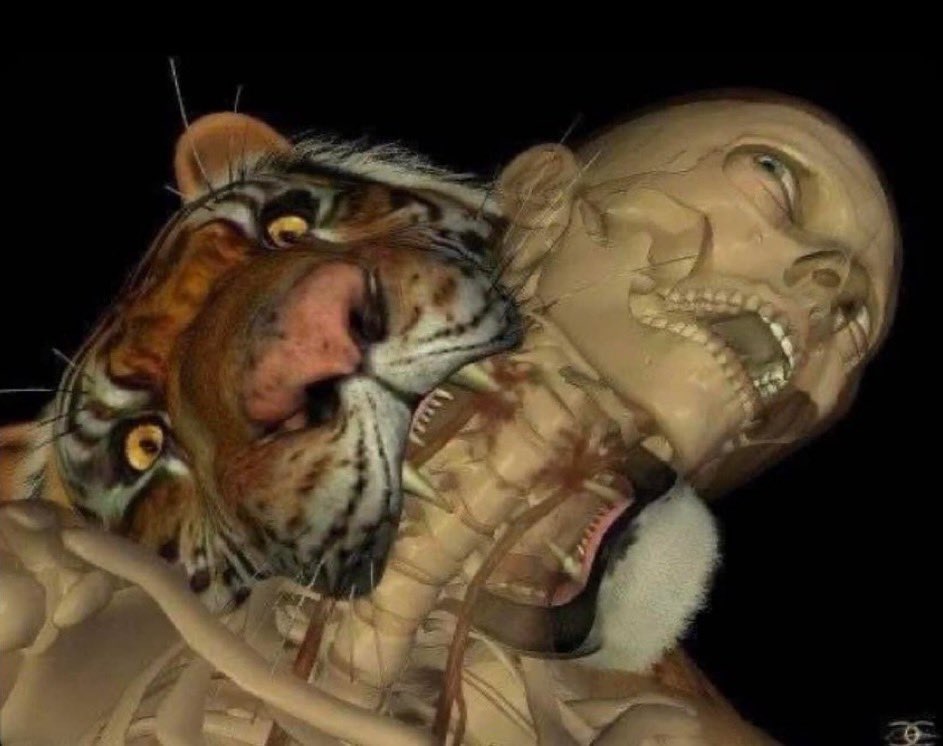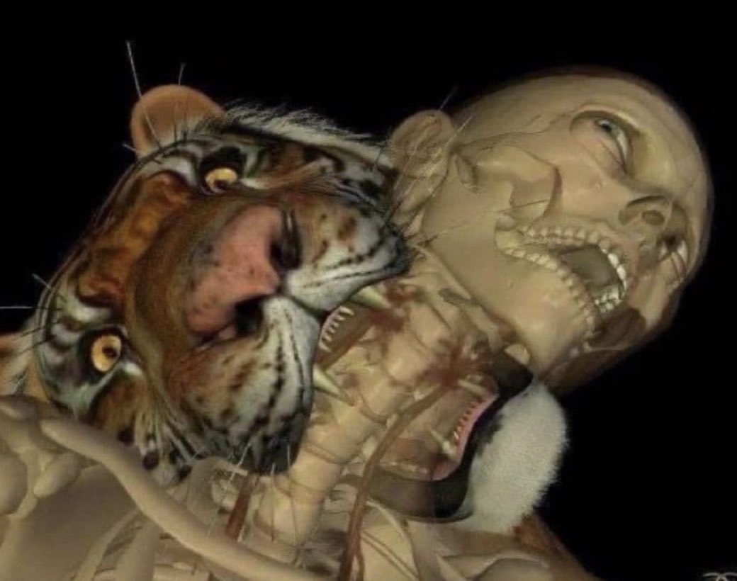 The 'Tiger Neck Bite' meme features a striking 3D visualization of a tiger biting into the neck of a human. This detailed and realistic graphic illustrates the powerful jaws of the tiger clamped around the human's neck, showcasing an intense moment where the tiger's teeth are embedded into the flesh.