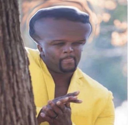 The Anthony Adams Rubbing Hands Together meme features a photograph of former professional football player Anthony 'Spice' Adams. In this image, he is dressed in a bright yellow jacket, peeking from behind a tree while rubbing his hands together and licking his lips. This particular pose has become well-known as a reaction image used in various online contexts.