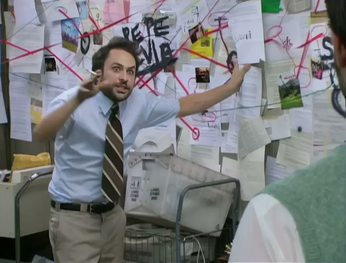 The 'Pepe Silvia' meme originates from a popular scene in the TV show 'It's Always Sunny in Philadelphia,' featuring the character Charlie Kelly, played by Charlie Day. In this scene, Charlie frenetically explains his conspiracy theory about 'Pepe Silvia,' a person he believes doesn't exist, despite the abundance of mail addressed to this name. This moment, characterized by Charlie's intense and disheveled appearance, complete with a cigarette hanging from his mouth and a board covered in papers and red string in the background, encapsulates his chaotic energy and has become a favorite scene among fans. The image of Charlie in front of this board is widespread as a reaction image and an exploitable meme template across various digital platforms.
