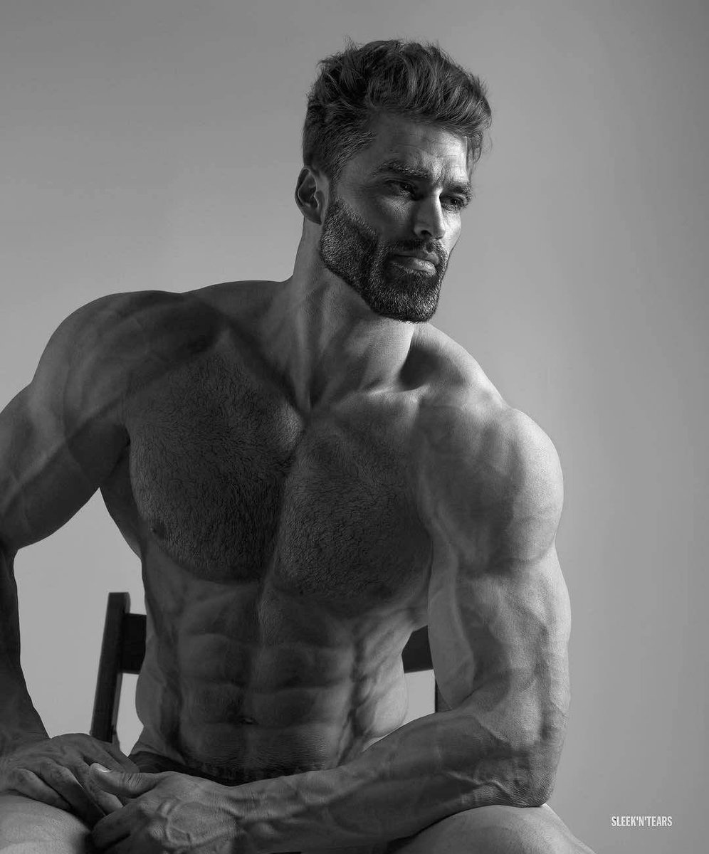 The GigaChad meme revolves around a fictional character named GigaChad, who is portrayed as the epitome of the ultra-masculine and strikingly attractive male archetype known as Chad Thundercock. The name "GigaChad" conveys an exaggerated version of this archetype. This character originates from a series of highly edited photographs, featuring models that are part of the art project by Russian photographer Krista Sudmalis for her project called Sleek'N'Tears. The character, while initially believed to be a real person, is actually a creation within this artistic context. The photographs are uploaded on the project's Instagram profile and official website. The meme gained popularity particularly within various incel communities online.