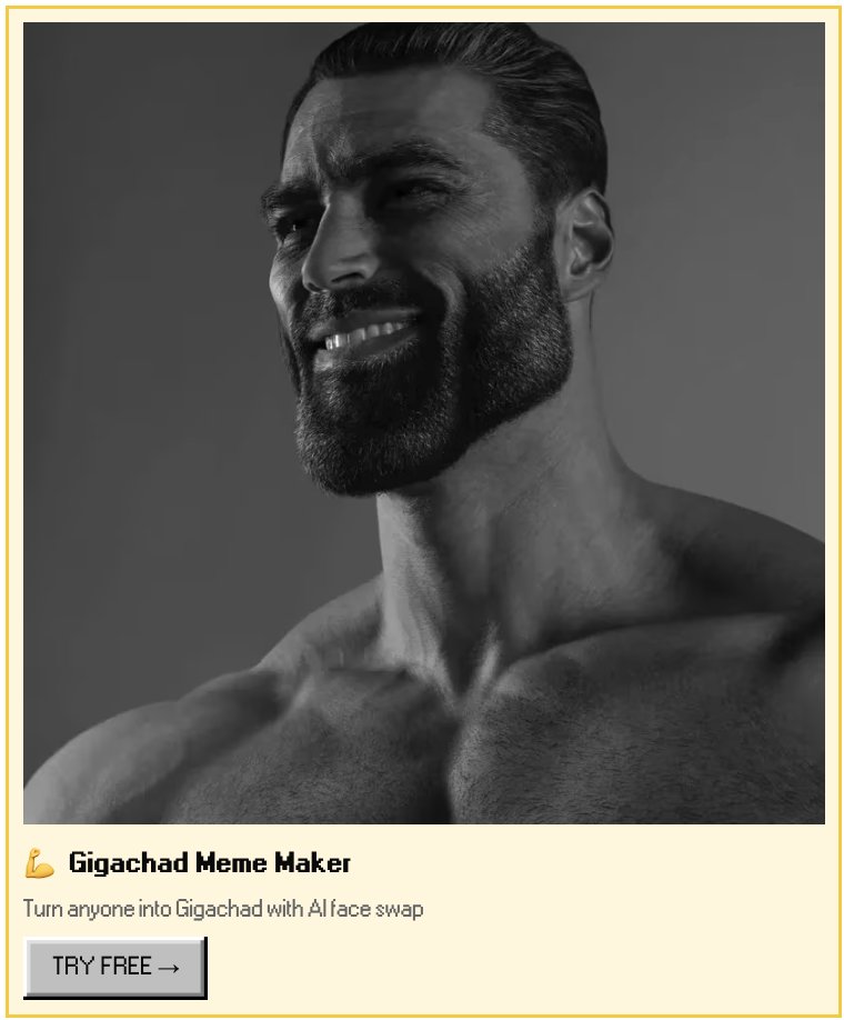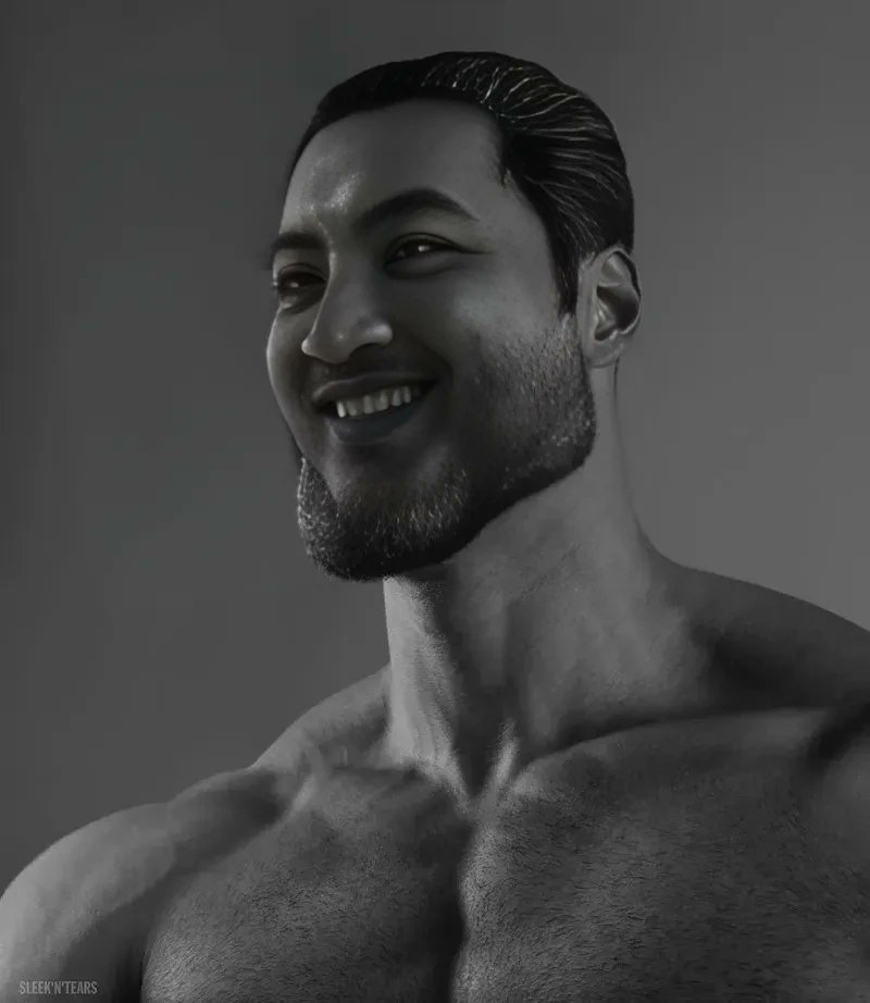 GigaChad is a meme and nickname originating from the art project known as berlin.1969 or Ernest Khalimov, a series of digitally manipulated photographs showcasing various models. These images, crafted by Russian photographer Krista Sudmalis for the project Sleek'N'Tears, personify an idealized male archetype characterized by extreme masculinity and physical attractiveness. This character, initially mistaken by many as a real individual, embodies the hyperbolic internet persona of 'Chad Thundercock,' a term used online to describe a supremely attractive and masculine man. The meme typically features a highly stylized black-and-white photo of a model with pronounced facial features, sporting a full beard and a muscular physique, embodying the epitome of male attractiveness and confidence.