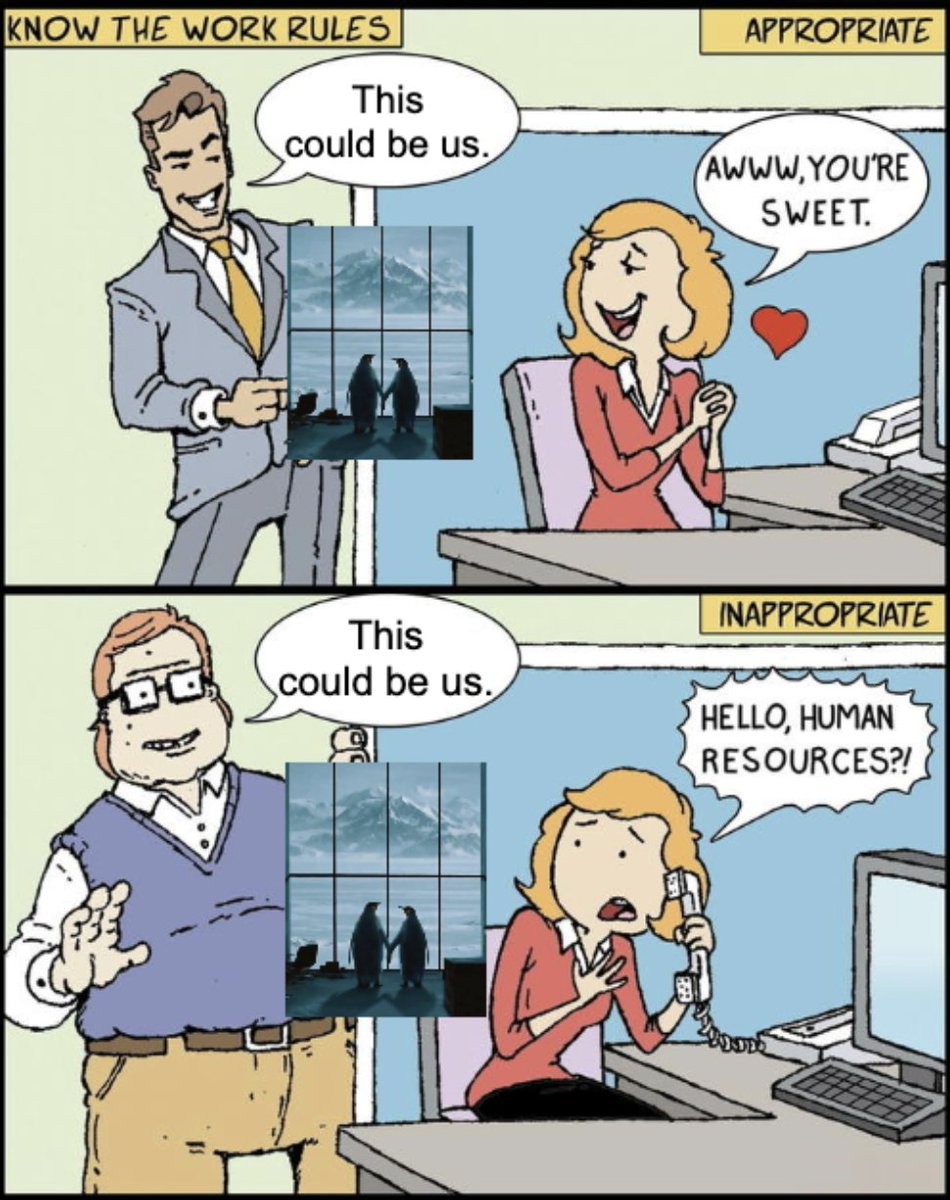 The 'Hello, Human Resources?!' meme, also referred to as 'Know the Work Rules,' is derived from a comic strip by Sunny Street that critiques perceived double standards in reactions to compliments based on the physical attractiveness of the male giving the compliment. The meme typically features two panels: the first shows a conventionally attractive man complimenting a female coworker who reacts positively, labeled as 'appropriate' behavior. The second panel shows a less attractive man giving the same compliment, to which the woman reacts negatively, labeled as 'inappropriate' behavior. This comic has been widely parodied by altering the text to reflect different scenarios or jokes.