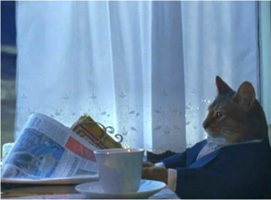 I Should Buy a Boat Cat, also known as "Sophisticated Cat" and "Fancy Cat," is part of the image macro series featuring a photograph of a cat in a suit, sitting at a table and reading a newspaper. The template often uses captions to express sudden realizations or desires, typically formatted as "I should buy a X."