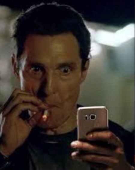The 'Matthew McConaughey Smoking' meme, also known as 'Rust Cohle Smoking,' features Rust Cohle, a character played by Matthew McConaughey in the mystery-thriller TV series 'True Detective.' In the meme, Rust is depicted aggressively inhaling from a cigarette. This image is commonly used online as a reaction to convey intense stress or worry.