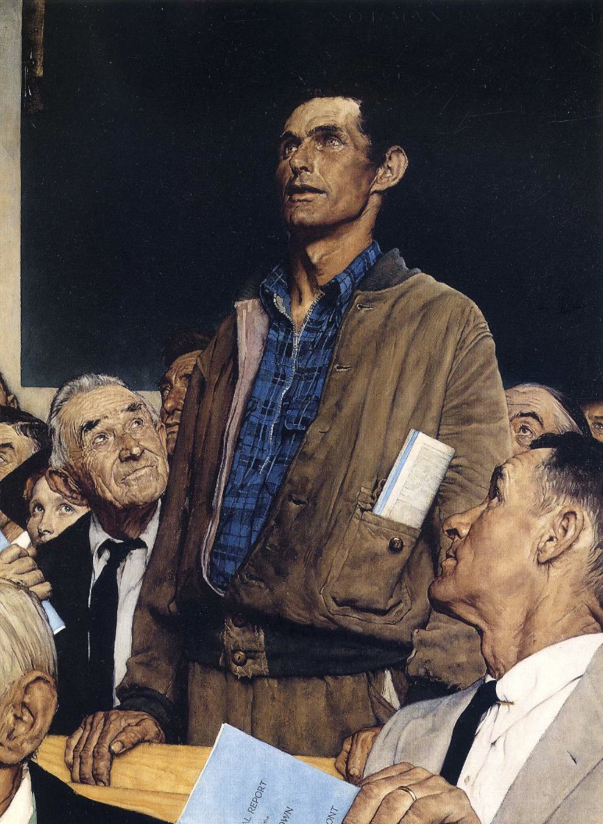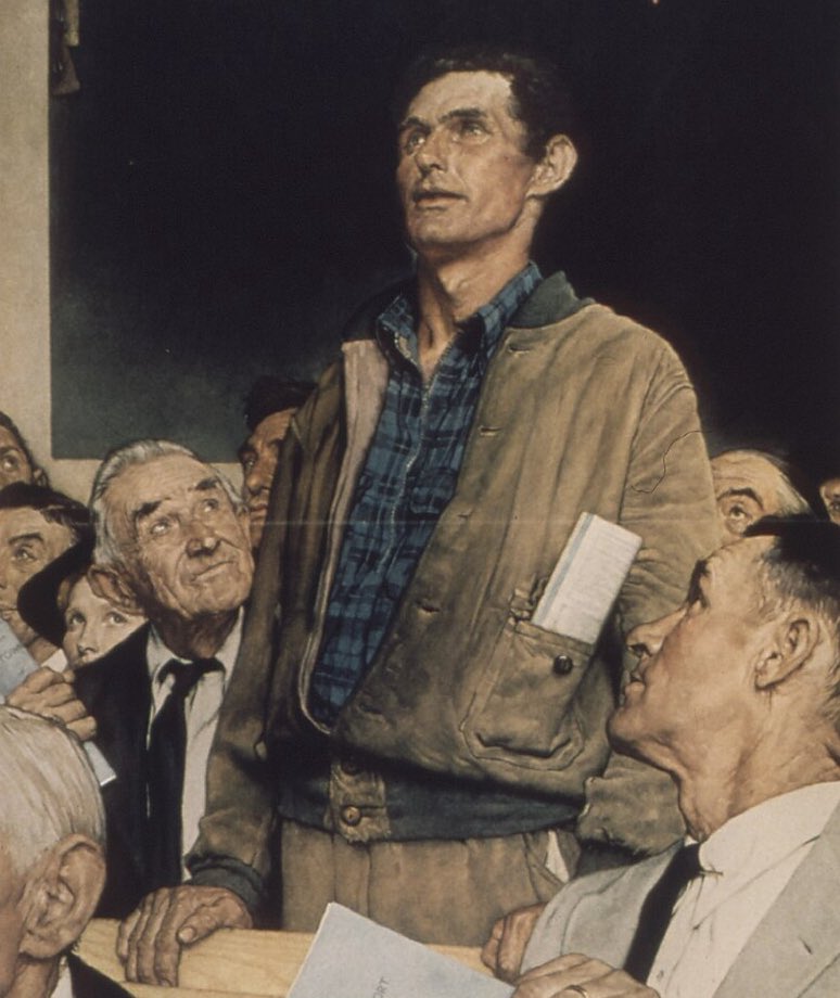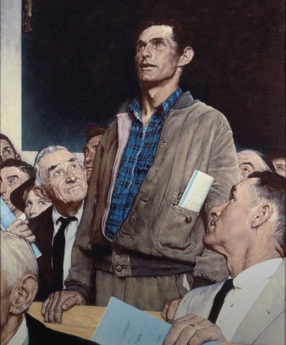 The 'Freedom of Speech' meme template derives from one of Norman Rockwell's Four Freedoms paintings, specifically the 'Freedom of Speech', first published on February 20th, 1943. You can read more about the original painting here. Instances of the painting used in a humorous or meme-related context date back to as early as 2008, as evidenced by archived images on TinEye. Additionally, the painting was part of a memetic Facebook campaign by the artist Mark Tomasi in July 2017, linking directly to his post here.