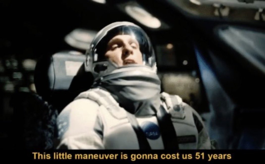 The film Interstellar, released by Warner Bros. Studios on November 7th, 2014 in the United States Interstellar on IMDb, includes a scene where the crew, lacking fuel, uses a black hole called Gargantua as a slingshot. In this pivotal moment, Cooper informs his crew that their maneuver will cost them 51 years on Earth. The earliest known meme adaptation of this scene emerged on May 28th, 2019, when Redditor BrodoFratgins posted it with a humorous caption about taking a detour to get gas. This video Watch on YouTube includes the relevant scene from the movie.