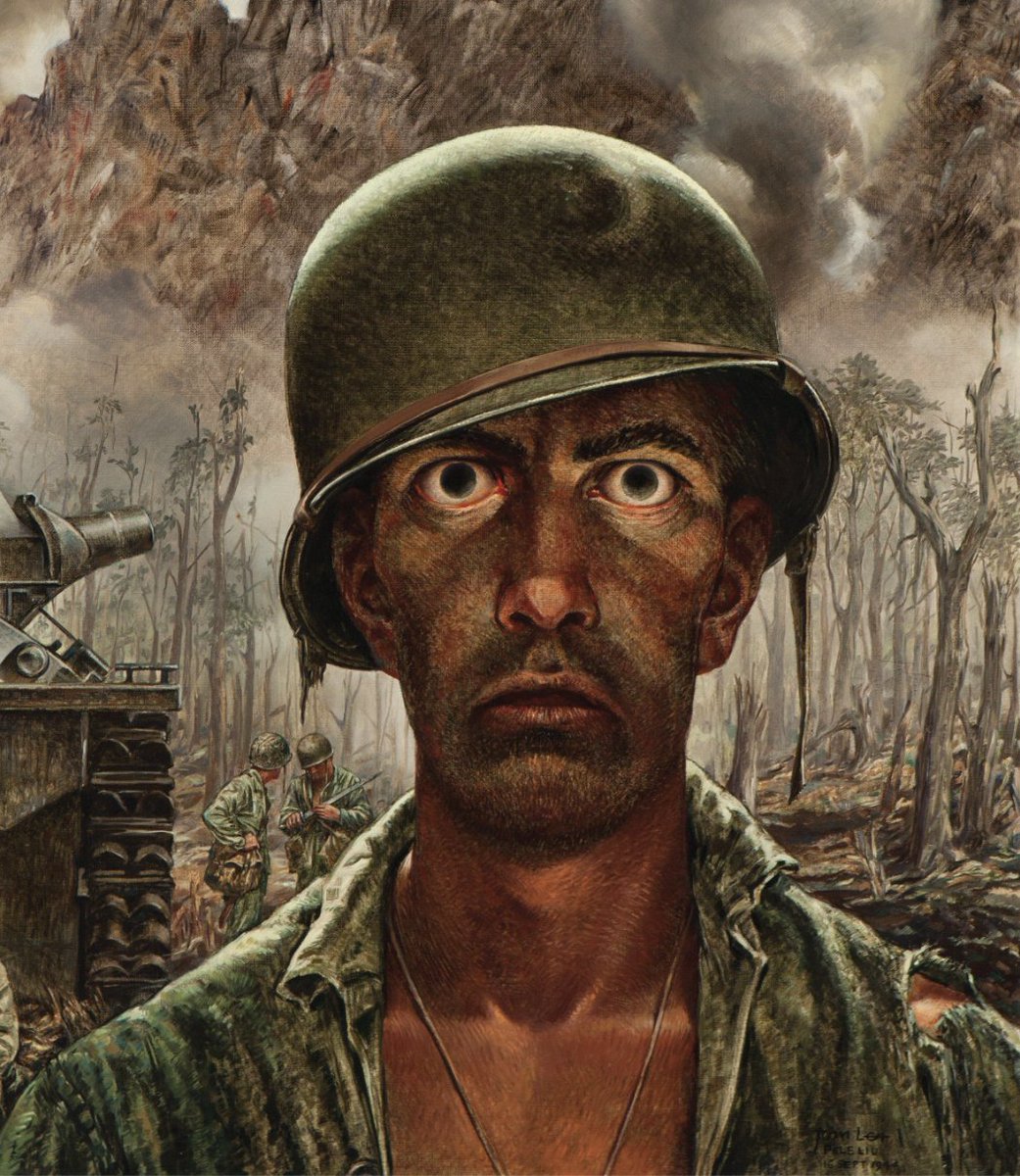The Thousand Yard Stare meme depicts a World War II soldier staring intensely with a look of dissociation and trauma, reflecting the term coined to describe the distant, unfocused gaze often associated with PTSD in combat soldiers. The term originated from Thomas Lea's painting 'The 2,000 Yard Stare', which captures the profound psychological effects of battle. Memetic use of this haunting expression became popular in the early 2020s, evolving into various exploitable formats and redraws like the Kurt Angle 1,000 Yard Stare and The Lorax 1,000 Yard Stare. The image is often used on social media platforms like Twitter (now X) to symbolize extreme stress or mentally overwhelming situations and is a favored reaction image among gimmick accounts and in Schizoposting context.